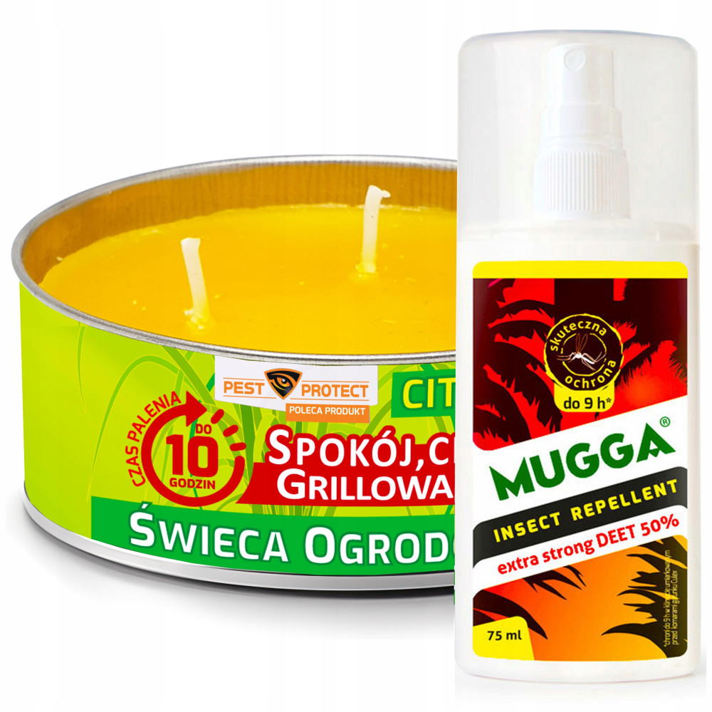 Niezawodny spray MUGGA 50% DEET, niezastąpiony preparat do walki z komarami + świeca ogrodowa Citronella
