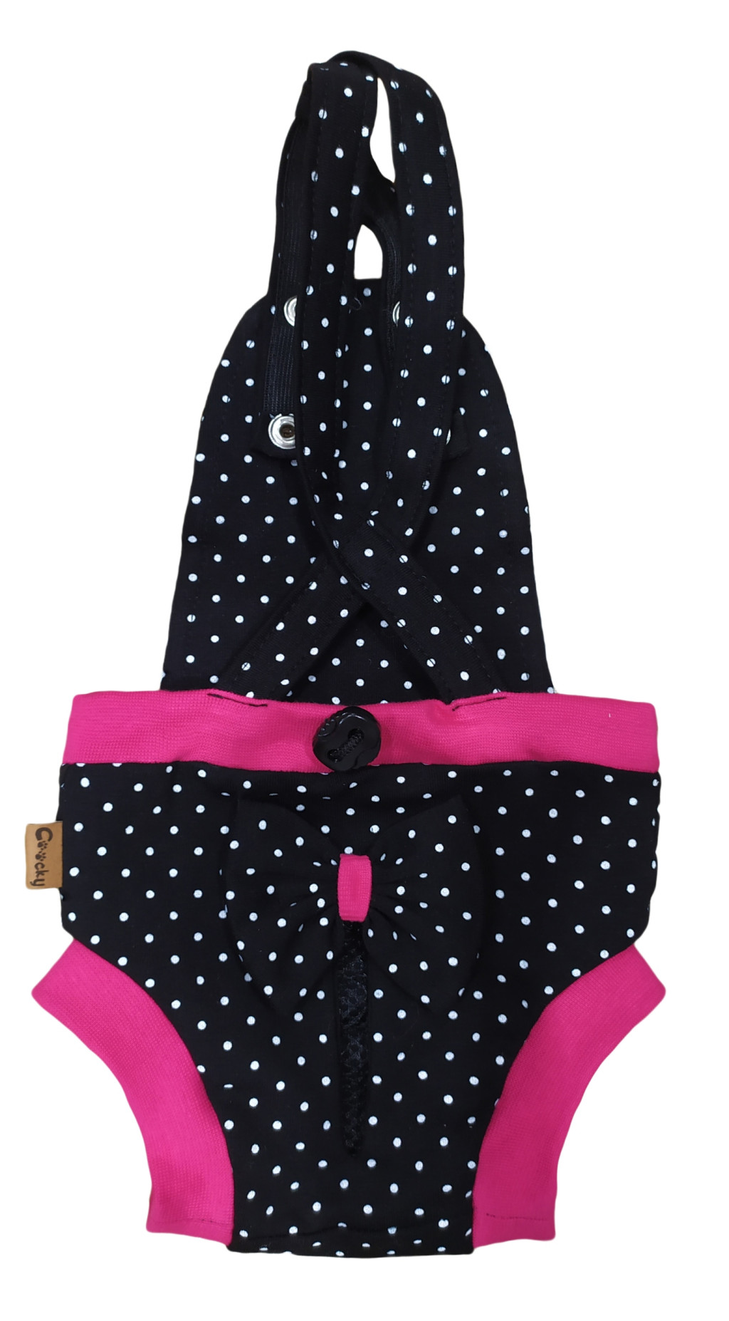 Majtki posiadają regulowane szelki, które niwelują możliwość zsuwania się majteczek z ciała suni. Majteczki z szelkami uszyte są w taki sposób, żeby nie uciskały i nie obdzierały oraz nie ograniczały ruchów suni.