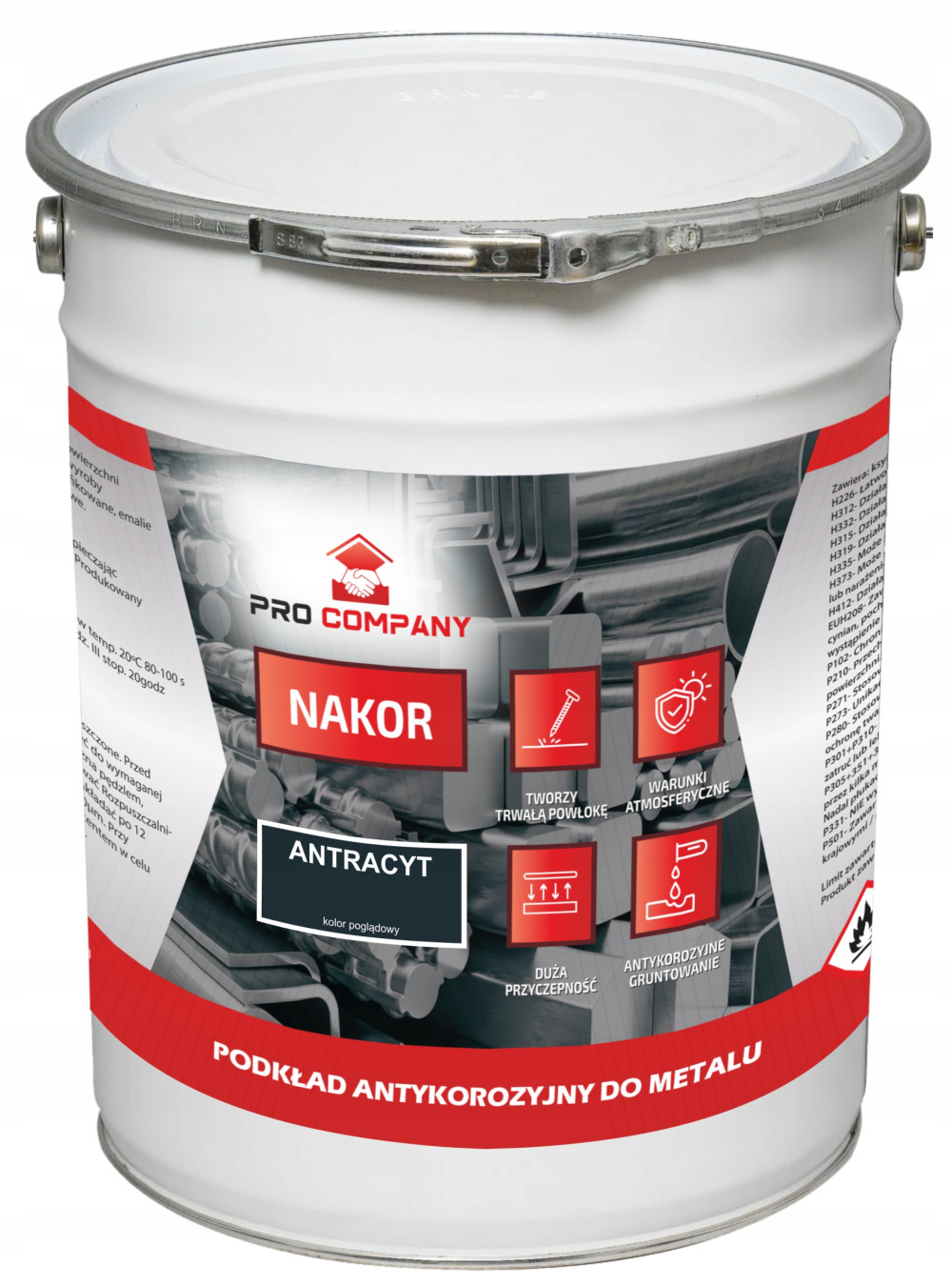 Nakor to wysokiej jakości produkt antykorozyjny firmy Pro Company, który został specjalnie stworzony do skutecznego gruntowania powierzchni stalowych i żeliwnych. Ten produkt jest niezwykle wszechstronny i może być używany jako podkład pod różne rodzaje powłok nawierzchniowych, takie jak emalie ftalowe i olejne, emalie ftalowe modyfikowane, emalie chlorokauczukowe, emalie styrenowo-akrylowe oraz emalie akrylowe.
