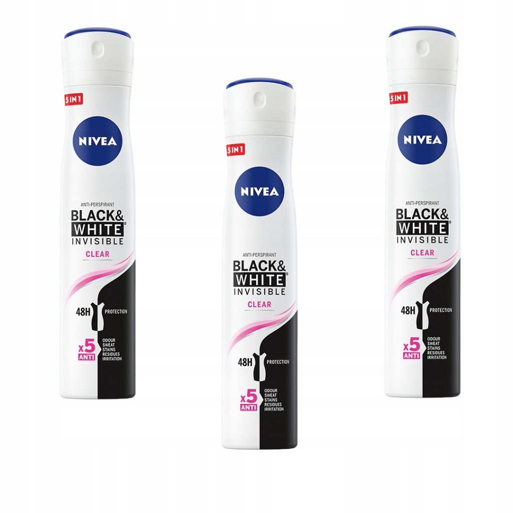 NIVEA Dezodorant Black & White Invisible Clear to produkt, który zapewni Ci skuteczną i niezawodną ochronę przed poceniem się, bez ryzyka pobrudzenia Twoich ulubionych ubrań. Dezodorant NIVEA zapewnia ochronę 5w1, chroni przed: nieprzyjemnym zapachem, poceniem, żółtymi plamami, białymi śladami oraz przed podrażnieniami. Antyperspirant dla kobiet nie pozostawia żółtych plam na białych ubraniach ani białych śladów na czarnych. Unikalna formuła chroni Cię przed nadmiernym poceniem się przez 48 godzin, jednocześnie pielęgnując Twoją skórę. Delikatny i kobiecy zapach zapewnia uczucie świeżości. Łagodność dezodrantu damskiego dla skóry została potwierdzona dermatologicznie.