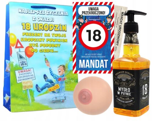 W zestawie znajdują się mydło w płynie, cycek gniotek, mandat urodzinowy oraz torebka prezentowa.