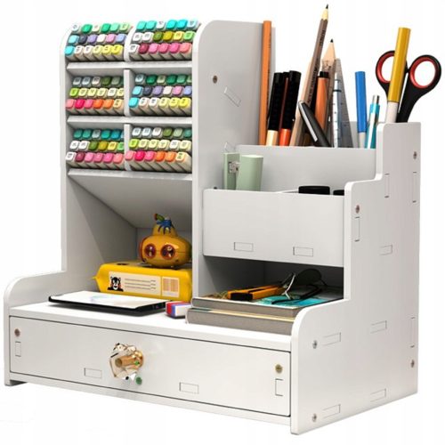 • 9 przegródek uchwyt na długopis do przechowywania zakreślaczy ołówki, 3 schowki do przechowywania nożyczek, lepkie, notatki. 1 szuflada wystarczająco dużo miejsca, aby pomieścić rodzaje przyborów szkolnych. Świetnie nadaje się również do przechowywania lakierów do paznokci, pomadek i innych drobnych przedmiotów