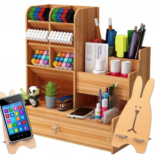 Drewniany organizer na biurko to praktyczny i elegancki sposób na utrzymanie porządku na biurku. Składa się z kilku półek, szuflady i innych przegródek, które umożliwiają przechowywanie różnych przedmiotów, takich jak długopisy, ołówki, nożyczki czy klucze.