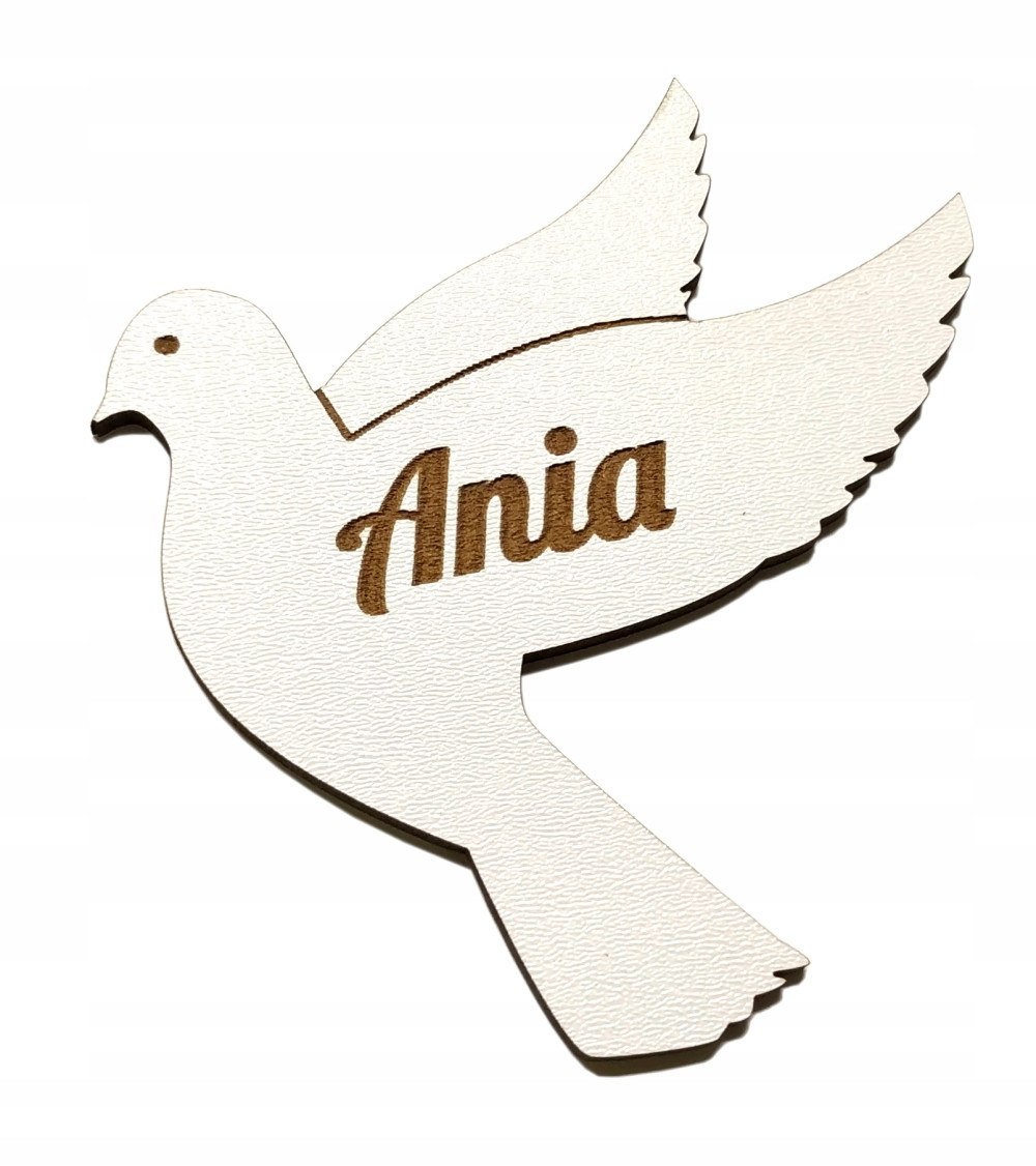 Piękny biały gołąbek z imieniem - dekoracja do kościoła z okazji I Komunii Świętej oraz Bierzmowania