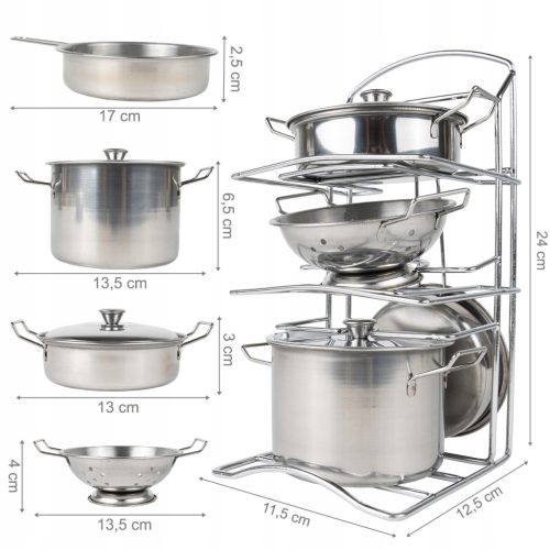 Garnki o różnej wielkości wraz ze stojakiem. Zestaw doskonale sprawdzi się podczas zabawy w domu, w gotowanie. Kuchnie dla dzieci z takim wyposażeniem mogą sprawić, że zabawa w gotowanie może stać się pasją dziecka.