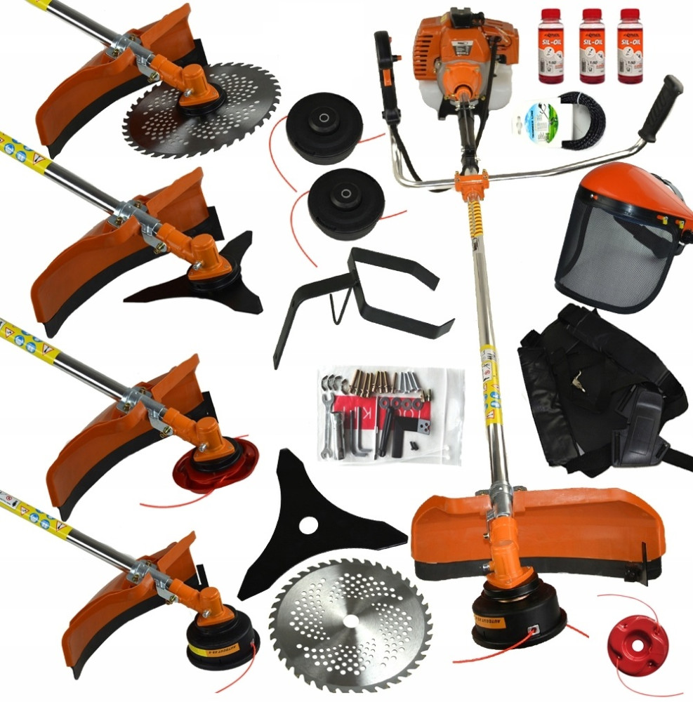 Głowica żyłkowa oraz trymer sprawdzi się w niskiej i średniej trawie, natomiast tarcza widiowa oraz trójząb świetnie sprawdzą się w gęsto porośniętej trawie czy zaroślach