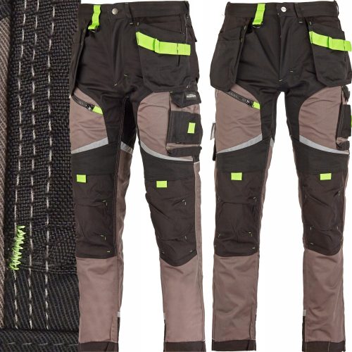 Pojemne kieszenie, o sprecyzowanym zastosowaniu, w tym uniwersalna miechowa, na telefon, długopis, miarę i uchwyt na młotek, wzmocnione materiałem CORDURA