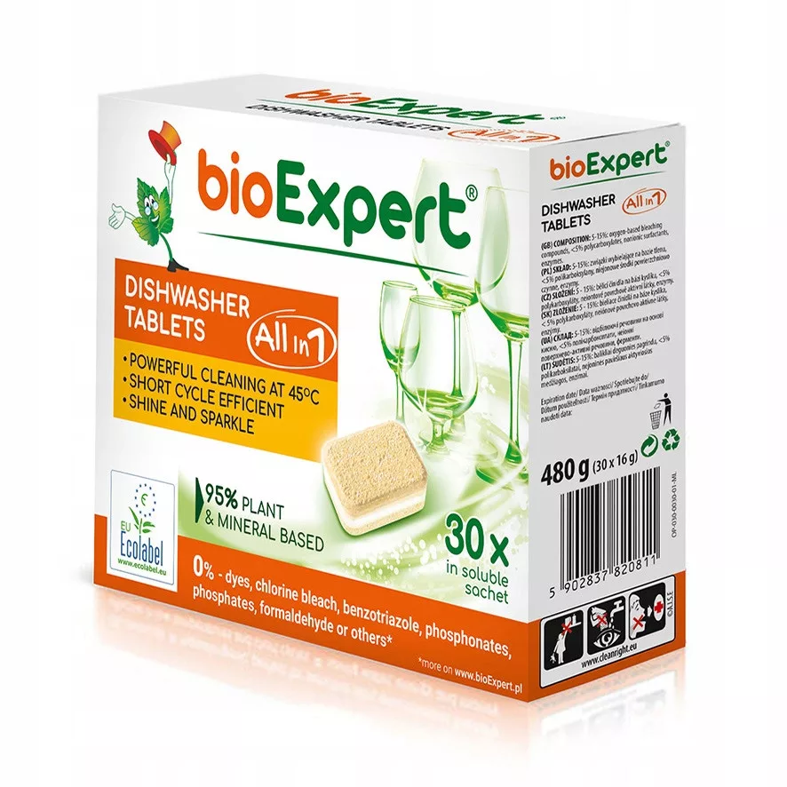 Ekologiczne tabletki do zmywarek potwierdzone międzynarodowym certyfikatem Ecolabel, w samorozpuszczalnej folii, zawierające szeroką gamę naturalnych składników, przeznaczone do zmywania we wszystkich typach zmywarek.
