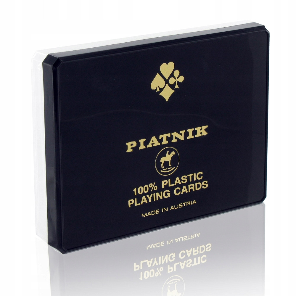 Najwyższej jakości w 100% plastikowe karty renomowanej firmy Ferd. Piatnik & Sohne. Czarne, tradycyjne pudełko zawiera 2 talie, składające się z 55 kart o wymiarach 58 x 89 mm. Idealne zarówno do brydża, pokera, remika jak i innych gier. Wyroby wiedeńskiej fabryki Ferd. Piatnik & Sohne od 1824 roku urzekają bogactwem wzorów i perfekcją wykonania. Jakość i tradycja!