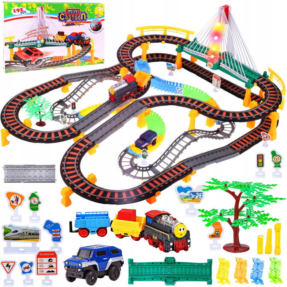 ✅Zestaw został wyposażony w: dwupoziomowy tor kolejowy, tor samochodowy, lokomotywę z wagonami, samochód oraz w wiele innych akcesoriów.