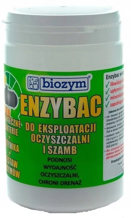 Enzybac to idealny produkt do wszelkiego rodzaju oczyszczalni przydomowych, zarówno tych tradycyjnych, jednokomorowych, jak również do oczyszczalni bardziej zaawansowanych technologicznie - ze złożem biologicznym czy osadem czynnym. Preparat nadaje się zarówno do rozruchu oczyszczalni jak i ciągłej ich eksploatacji. Nie ma konieczności zakupu specjalnego biopreparatu do rozruchu. Enzybac składa się w głównej mierze z bakterii oraz immobilizowanych enzymów znacznie przyspieszających procesy biochemicznego rozkładu w ściekach. Enzymy i bakterie zawarte w preparacie powodują rozkładanie złożonych związków organicznych występujących w ściekach (węglowodanów, białek, tłuszczów) na związki proste: dwutlenek węgla, wodę i związki azotu. Regularne stosowanie Enzybaca w praktyce oznacza bezproblemową obsługę oczyszczalni czy szamba, bez nieprzyjemnych zapachów. Praca oczyszczalni utrzymywana jest w maksymalnym zakresie jej wydajności.