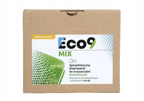 Eco9 MIX to koncentrat skutecznych bakterii (ponad 2 miliardy w 1 gramie preparatu) wzbogacony o składnik przeciwko tłuszczom. Stosuje się go do mikrobiologicznej obróbki ścieków i nieczystości w oczyszczalniach, szambach, zbiornikach gnojówki i gnojowicy. Regularne stosowanie preparatu Eco9 MIX prowadzi do poprawy skuteczności oczyszczania, zmniejsza ilość osadu i przeciwdziała powstawaniu odorów.