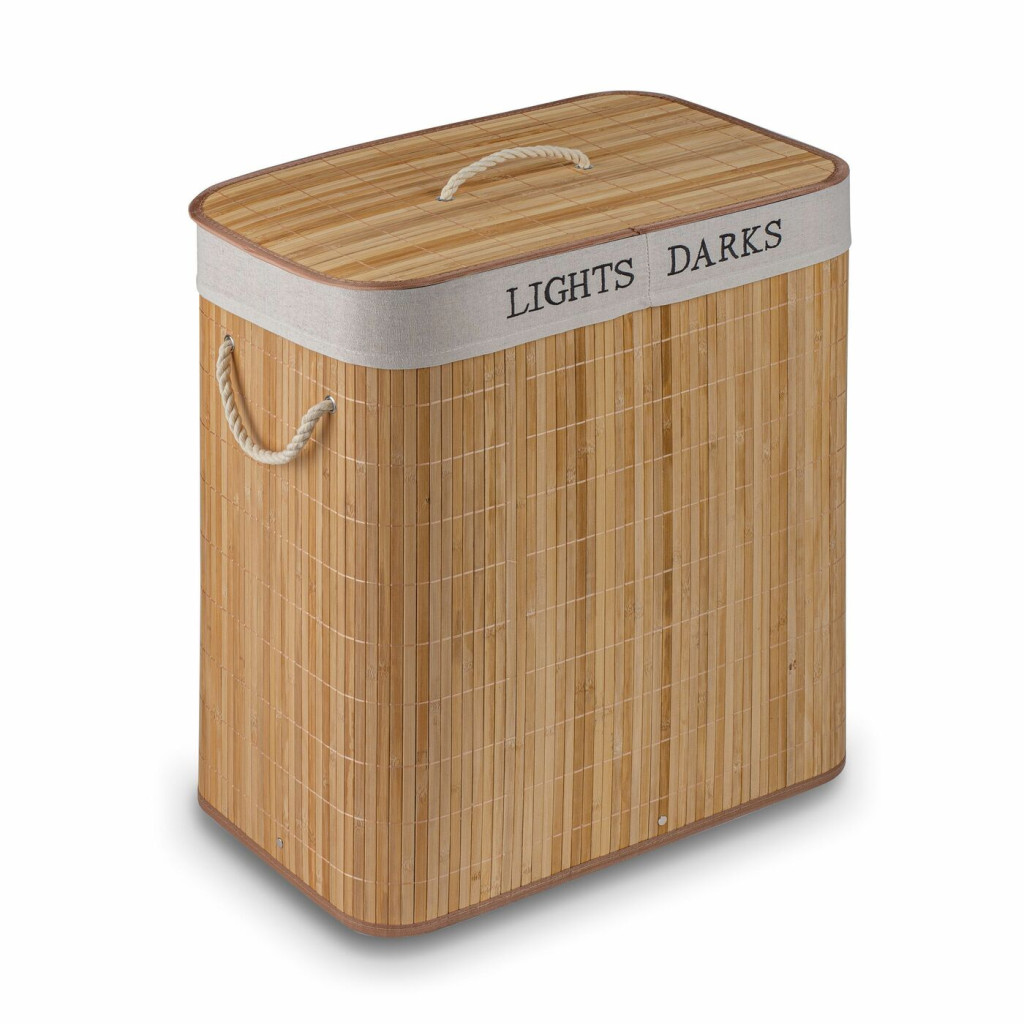 Dwukomorowy kosz na pranie i brudną bieliznę Tadar 52 x 32 x 63 cm ma pojemność 105 litrów. Wykonano go z bambusowych listewek. Wnętrze kosza wyścieła zdejmowany, tekstylny worek. Model ma uchylaną klapę i jest ekologiczny. Bez obaw wstawisz model do łazienki i podkreślisz jej aranżację. Uchronisz siebie i innych domowników przed brzydkimi zapachami bielizny, dzięki dobrej wentylacji zawartości. Wykorzystasz go nie tylko jako praktyczny kosz na brudne pranie. Sprawdzi się też jako stylowy i uniwersalny kosz do przechowywania. W pokoju dziecka może pełnić funkcję dużego pojemnika na zabawki. W prosty sposób zadbasz o czystość worka mocowanego wewnątrz kosza. Zyskasz też możliwość wygodnego przenoszenia kosza razem z zawartością – produkt wyposażono w dwa sznurowe uchwyty. Ułatwia segregowania odzieży do prania.