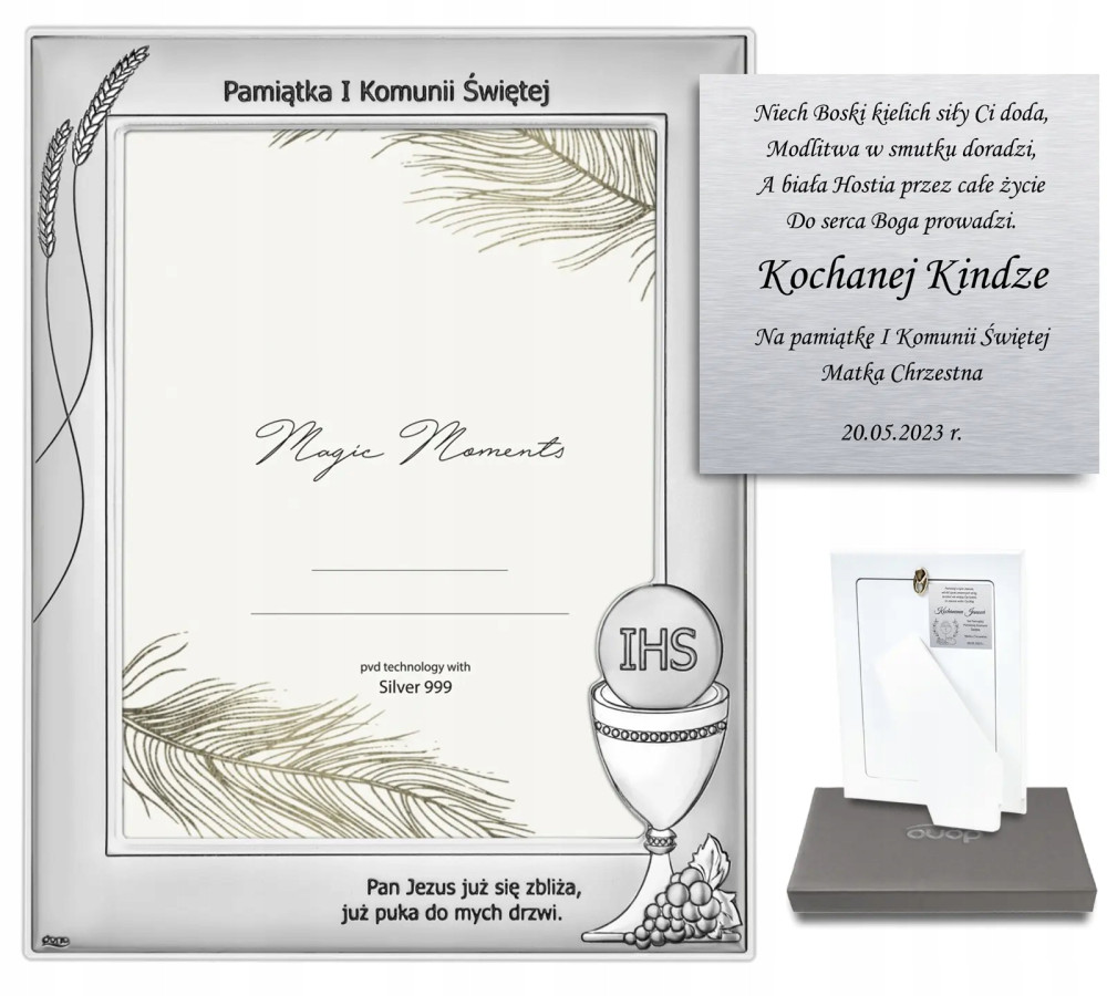 Ramka została ozdobiona elementami eucharystycznymi, które nadają jej elegancki styl. Są to kielich z hostią, winogronem i kłosami zbóż. U góry znajduje się napis "Pamiątka Pierwszej Komunii Świętej". Natomiast na dole umieszczono cytat: "Pan Jezus już się zbliża, już puka do mych drzwi". Ramka może pomieścić zdjęcie o wymiarach 10x15 cm, a jej całkowity wymiary to 13,8x18,6 cm. Z tyłu ramki znajduje się praktyczna podpórka, umożliwiająca postawienie ramki na półce.