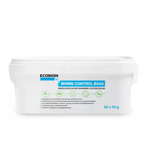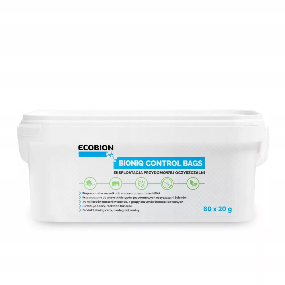 BioniQ Control ‒ profesjonalny produkt biotechnologiczny przeznaczony dla użytkowników wszystkich typów przydomowych oczyszczalni ścieków. Formulacja w saszetkach wodo-rozpuszczalnych PVA jest wygodną alternatywą dla użytkowników ceniących sobie komfort dozowania. Zawartość biopreparatu przewidziany jest na pół roku stosowania - 1 saszetka na tydzień - 52 tygodnie. Z biopreparatem dostarczamy 60 saszetek, tak aby użytkownik miał zapas technologiczny w przypadku konieczności dozowania większej ilości saszetek jak np. podczas wizyty większej ilości użytkowników w gospodarstwie domowym. Skład biopreparatu oparty jest na przemysłowych, niepatogennych szczepach bakteryjnych z rodzaju Bacillus, które charakteryzuje: