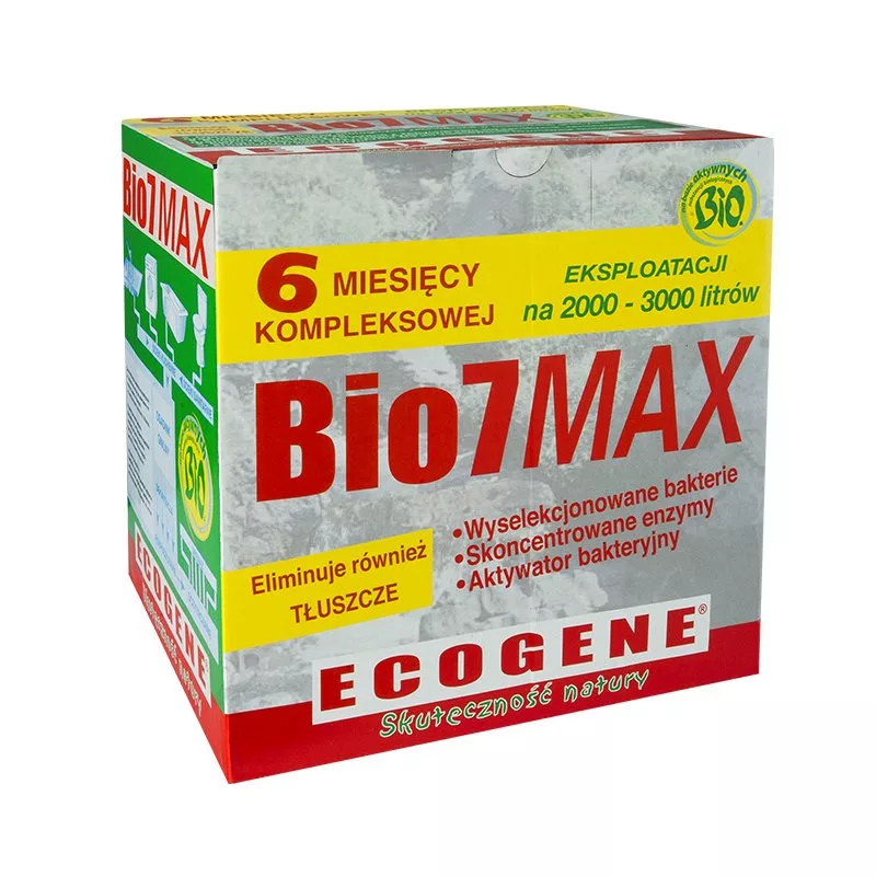 Bio7 Max (Special Fosses Toutes Eaux) to biopreparat dwufazowy, przeznaczony w szczególności do instalacji nie wyposażonych w separator tłuszczu. Biopreparat eksploatacyjny został dodatkowo wzbogacony o wyselekcjonowane bakterie i enzymy rozkładające tłuszcze. Specjalna receptura 2w1 opracowana została tak aby jeszcze bardziej poprawić pracę oczyszczalni ścieków poprzez wyeliminowanie problemu zatłuszczenia instalacji. Składniki preparatu zapobiegają powstawaniu tzw. „kożucha tłuszczowego” oraz chronią przed zatorami tłuszczowymi elementy funkcjonalne instalacji (rury, przepompownie, drenaże, studnie chłonne).