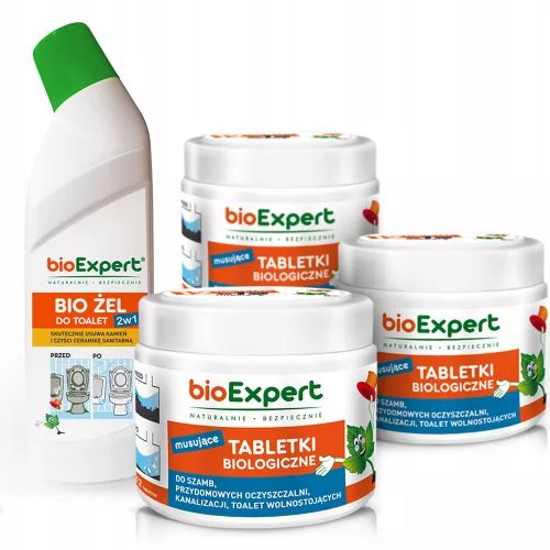 Musujące tabletki biologiczne bioExpert do szamb, przydomowych oczyszczalni ścieków i kanalizacji, to chemicznie obojętny aktywator biologiczny zawierający żywe, bezpieczne dla zdrowia kultury bakteryjne oraz minerały i pożywki organiczne.