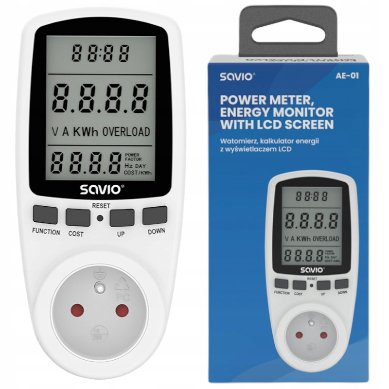 ⭐Watomierz, kalkulator energii z wyświetlaczem LCD Savio AE-01, to niezawodne urządzenie, które pozwala Ci monitorować i kontrolować zużycie energii elektrycznej w Twoim domu.