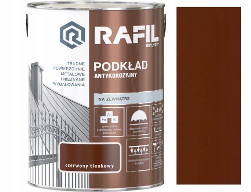 Farba gruntująca Rafil PODKŁAD ANTYKOROZYJNY stosowana jest na podłoża ocynkowane, stalowe i aluminiowe na zewnątrz. Wymagana jest w przypadku powierzchni trudnych lub wymalowanych nieznaną farbą. Tworzy matową, elastyczną powłokę. Charakteryzuje się doskonałą przyczepnością do podłoża, a w zestawie z farbą nawierzchniową Rafil RADACH, Rafil EKO RADACH lub Rafil DO BRAM I OGRODZEŃ zapewnia długotrwałą ochronę antykorozyjną.