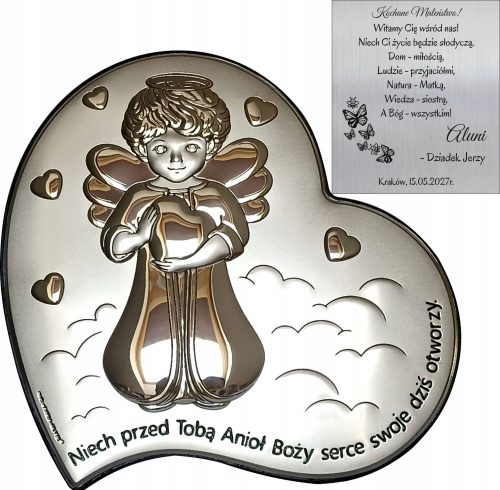 Srebrny obrazek przedstawiający wizerunek Aniołka trzymającego serduszko. Doskonały prezent z okazji urodzin, na Chrzest, Pierwszy Roczek, I Komunię Świętą jako pamiątka czy dekoracja.