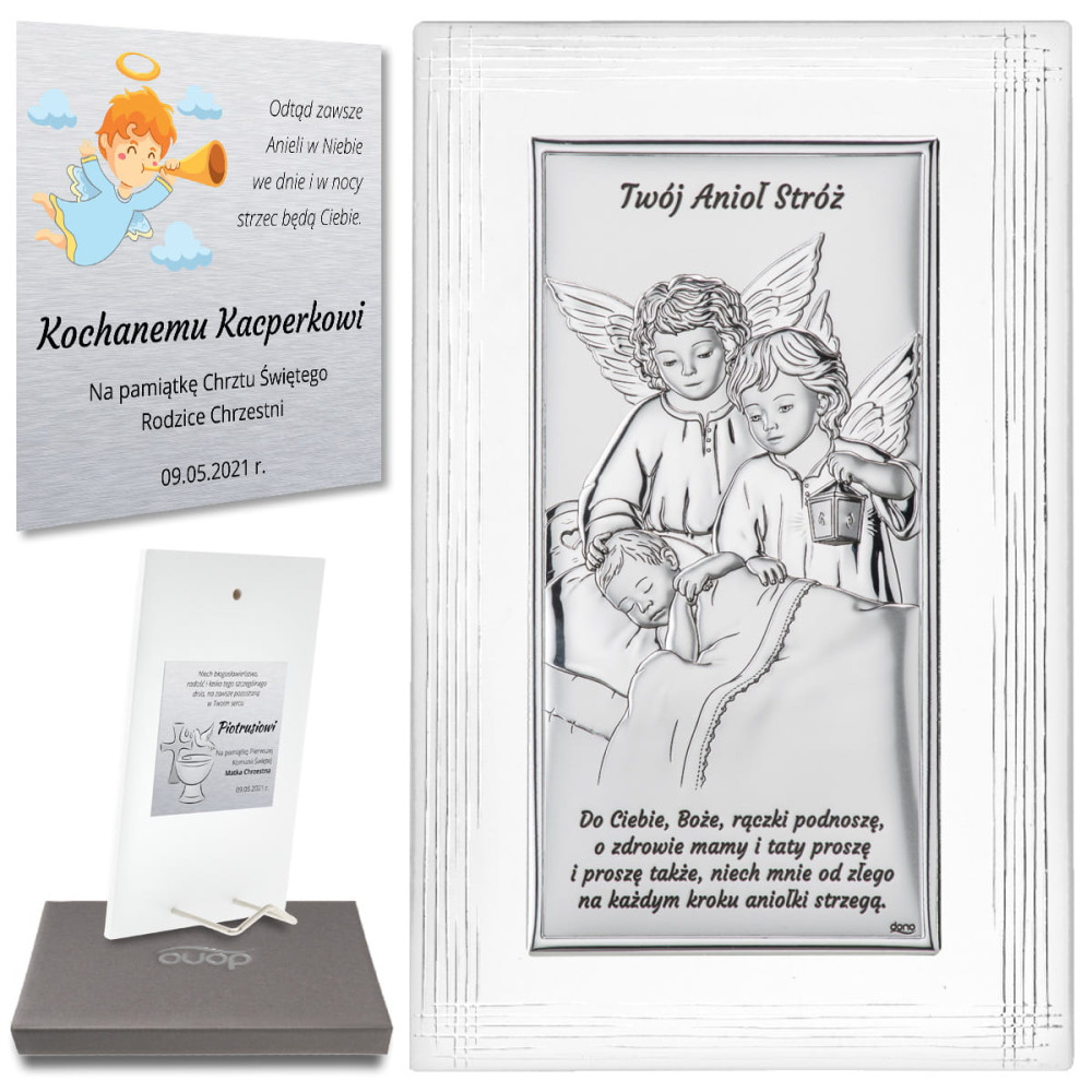 Srebrny obrazek przedstawiający dwa Aniołki Stróże czuwające nad dzieckiem. Obrazek posiada białą ozdobną ramkę a na górze umieszczony został napis "Twój Anioł Stróż" a na dole modlitwa "Do Ciebie Boże...". Będzie on idealnym prezentem z okazji Chrztu, Komunii czy narodzin dziecka.