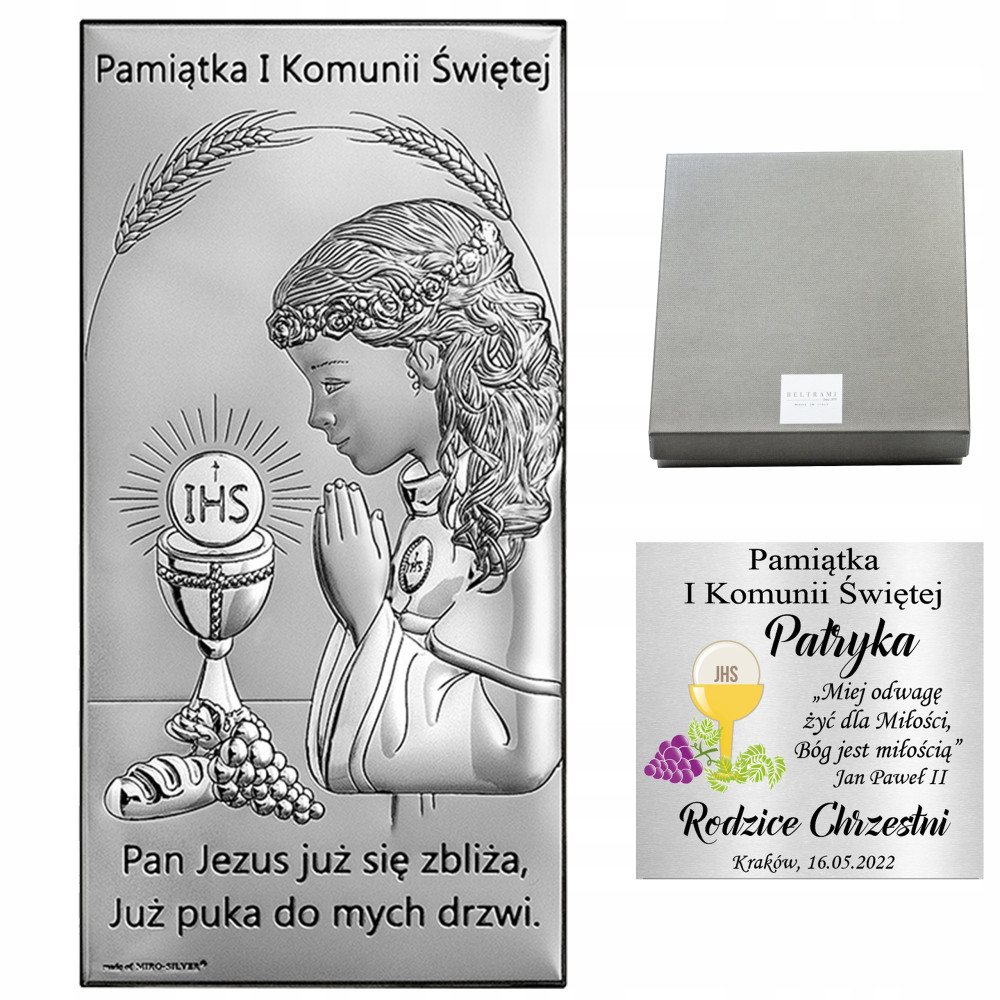 Srebrny obrazek z wizerunkiem dziecka przystępującego do Sakramentu I Komunii Swiętej. Postać modlącego się dziecka ze złożonymi rękami oddaje atmosferę podniosłej chwili w momencie pierwszego Pełnego Uczestnictwa we Mszy Świętej. Pamiątka I Komunii wykonana z dbałością o szczegóły i detale. Obrazek wykonany został w klasycznym kształcie stanowi niezapomnianą pamiątkę Pierwszej Komunii Świętej.