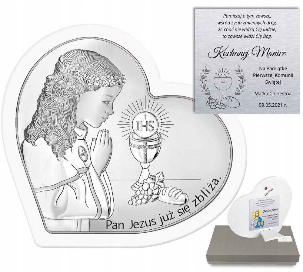 Srebrny obrazek w kształcie serduszka przedstawia dziewczynkę przystępującą do Pierwszej Komunii Świętej. Całość umieszczona w delikatnej białej ramce. Na dole obrazka znajduje się napis "Pan Jezus już się zbliża". Taki obrazek to wyjątkowy prezent lub pamiątka dla dziewczynki na specjalną okazję jaką jest Pierwsza Komunia.
