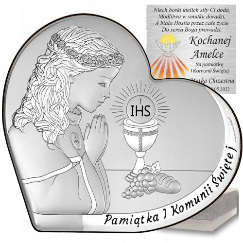 Srebrny obrazek z wizerunkiem dziecka przystępującego do Sakramentu I Komunii Swiętej. Postać modlącego się dziecka ze złożonymi rękami oddaje atmosferę podniosłej chwili w momencie pierwszego Pełnego Uczestnictwa we Mszy Świętej. Pamiątka I Komunii wykonana z dbałością o szczegóły i detale. Obrazek wykonany został w kształcie serca i stanowi niezapomnianą pamiątkę Pierwszej Komunii Świętej.
