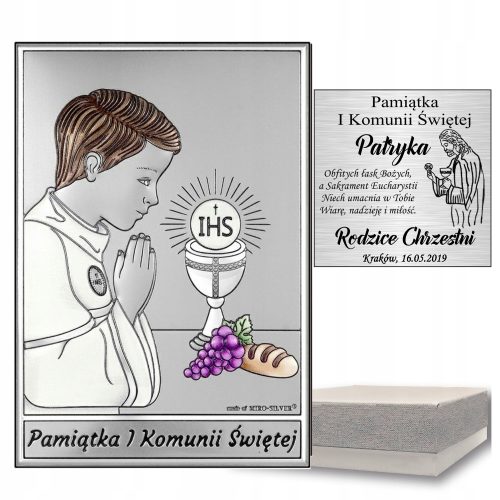 Srebrny obrazek z wizerunkiem chłopca przystępującego do Sakramentu I Komunii Swiętej. Postać modlącego się dziecka ze złożonymi rękami oddaje atmosferę podniosłej chwili w momencie pierwszego Pełnego Uczestnictwa we Mszy Świętej. Pamiątka I Komunii wykonana z dbałością o szczegóły i detale. Obrazek wykonany został w klasycznym kształcie stanowi niezapomnianą pamiątkę Pierwszej Komunii Świętej.