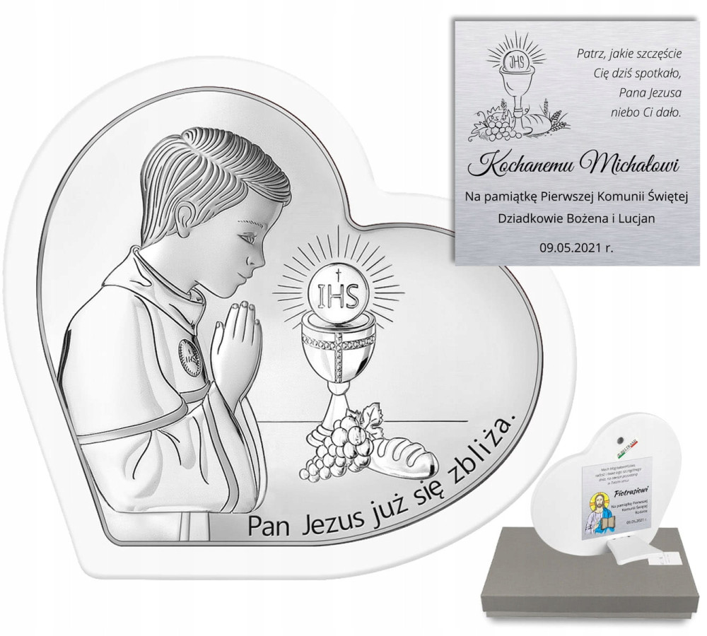 Srebrny obrazek w kształcie serduszka przedstawia chłopca przystępującego do Pierwszej Komunii Świętej. Obraz posiada białą ramkę a na dole znajduje się napis "Pan Jezus już się zbliża". Taki obrazek to wyjątkowy prezent lub pamiątka dla chłopca na specjalną okazję jaką jest Pierwsza Komunia.