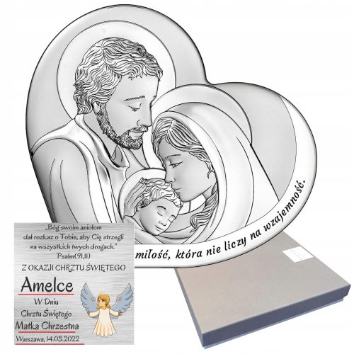 Szykowny srebrny obrazek Święta Rodzina - Matka Boska z Józefem i Dzieciątkiem. Symbol ten przypomina, jak ważna jest rodzina, zwłaszcza ta najbliższa i pielęgnowanie więzi pomiędzy poszczególnymi jej członkami. Pomaga w trudnych okresach i odgrywa dużą rolę w rodzinnych relacjach.