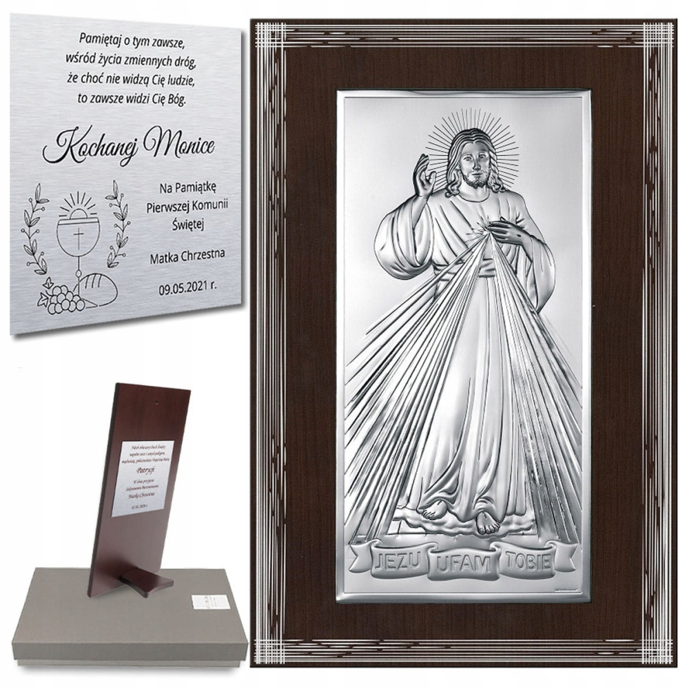 Srebrny obrazek przedstawiający wizerunek Pana Jezusa Miłosiernego, u dołu z podpisem "Jezu Ufam Tobie." Dodatkowo całość jest umieszczona na ciemnym, ozdobnym panelu. Obraz stworzony jest przez firmę a wszystkie ozdobne elementy na panelu wykonane są ze srebra.