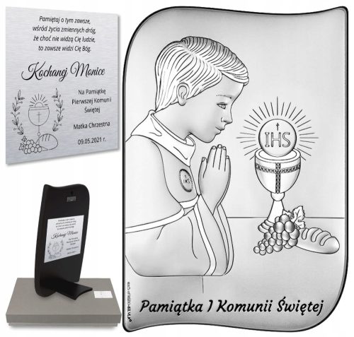 Srebrny obrazek na Pierwszą Komunię Świętą dla Chłopczyka w kształcie serca. Na dole obrazka znajduje się napis: "Pamiątka I Komunii Świętej", co podkreśla jego symboliczne znaczenie. Praktyczne i eleganckie opakowanie sprawia, że obrazek nadaje się idealnie na prezent. Wybierz ten uroczy obrazek jako wyjątkową pamiątkę z okazji Pierwszej Komunii. Będzie przypominać o ważnym wydarzeniu przez wiele lat.