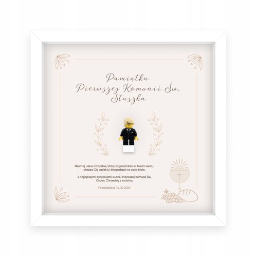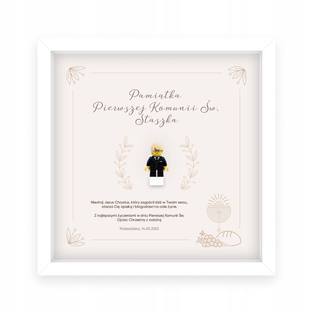 Ramka zawiera figurkę Lego. Dopasowujemy ją do wyglądu dziecka. W ten sposób powstaje spersonalizowany upominek, który na długo pozostanie w pamięci obdarowanego.