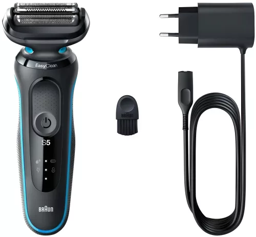 Golarka elektryczna dla mężczyzn BRAUN Seria 5 ułatwia golenie dzięki 3 elastycznym ostrzom, które dostosowują się do konturów twarzy. System EasyClean sprawia, że czyszczenie jest szybkie i łatwe, bez konieczności zdejmowania głowicy golącej. Ta elektryczna maszynka dla mężczyzn jest w 100% wodoodporna i jest kompatybilna z systemem EasyClick.