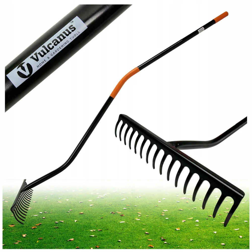 Ergonomiczne grabie 16-zębne VULCANUS doskonale usuwają z trawnika liście, skoszoną trawę lub inne pozostałości organiczne. Ułatwiają także wyrównywanie terenu i odpowiednie rozprowadzanie podłoża lub piasku.