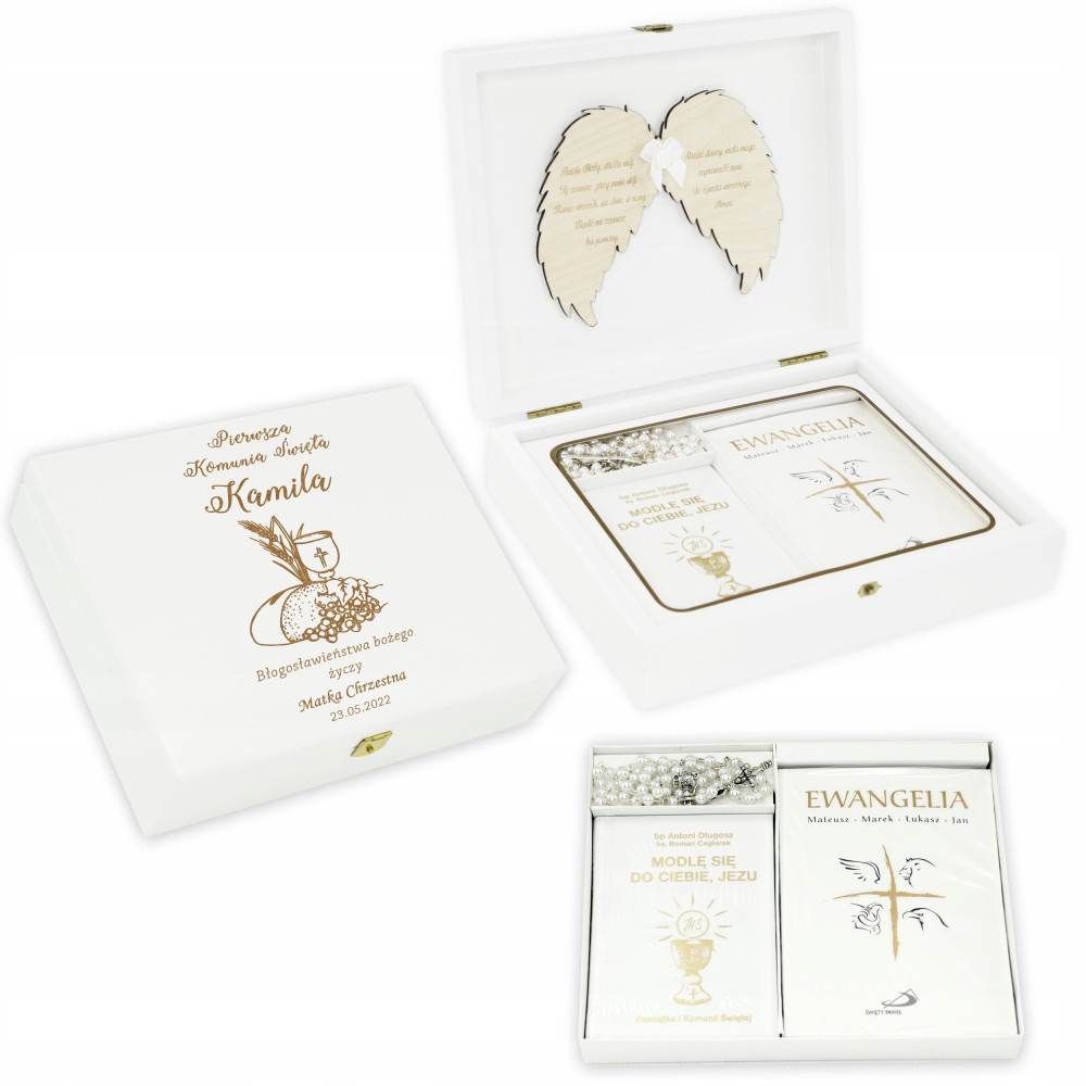 Piękna pamiątka I Komunii Świętej w białym DREWNIANYM pudełko z grawerem w której znajduje się prezent dla dziecka.
