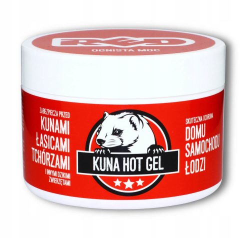 Odstraszacz KUNA HOT GEL marki RED to gotowy do użycia preparat przeznaczony do ochrony i zabezpieczenia powierzchni w m.in. domach, samochodach, łodziach itp. przed kunami, łasicami, tchórzami, lisami i innymi zwierzętami mogącymi wyrządzić szkody, w tym gryzoniami takimi jak: myszy i szczury. Dzięki skoncentrowanej formie KUNA HOT GEL pozwala chronić przed przegryzaniem i niszczeniem kabli, przewodów oraz mat wygłuszających montowanych w komorach silników. Zabezpiecza poddasza, rynny i przedmioty w ogrodzie. Efekt działania utrzymuje się nawet do 12 tygodni.