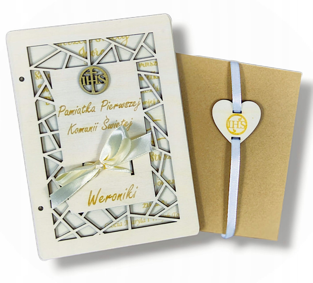 Drewnienia personalizowana pamiątka Pierwszej Komunii Świętej doskonała jako dodatek do prezentu lub drobny upominek.