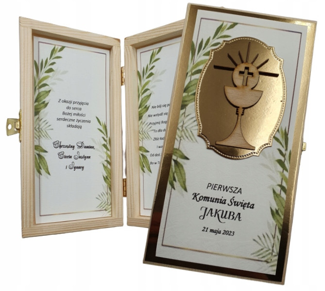 Pudełko zawiera imię dziecka jak i również osób wręczających prezent. Do wyboru maja Państwo również dużą ilość życzeń. Można przesłać własne.