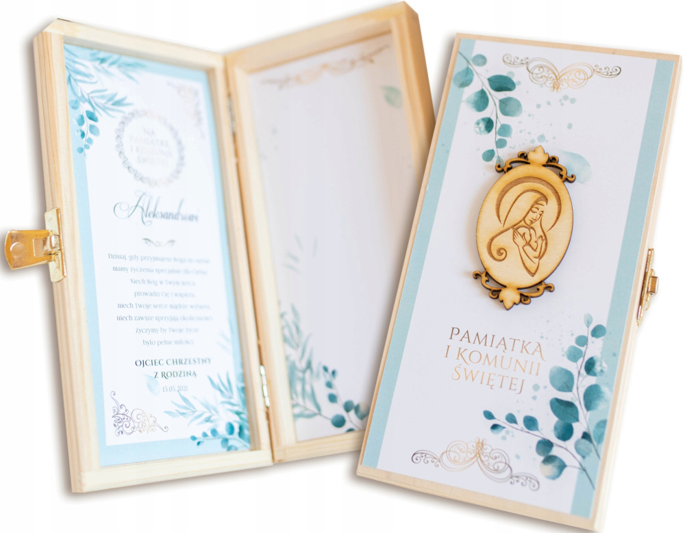 Pudełko jest dostępne w dwóch wyjątkowych kolorach: różowym oraz błękitnym, posiada ozdobny papier z napisem "Pamiątka I Komunii Świętej" piękny drewniany medalik z wizerunkiem Matki Bożej, wewnętrzną dedykację i elegancką złotą klamerkę, dzięki której pieniądze umieszczone wewnątrz pudełka nie wypadną.
