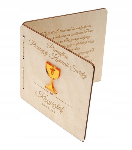 Pierwsza strona jest to połonczenie drewna z symbolem kielicha koloru złotego oraz wygrawerowanym imieniem oraz datą uroczystości.