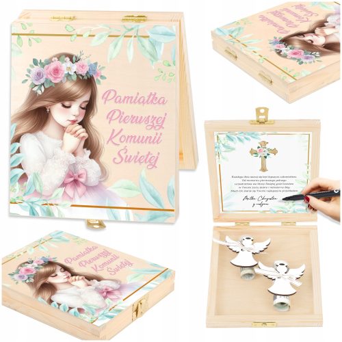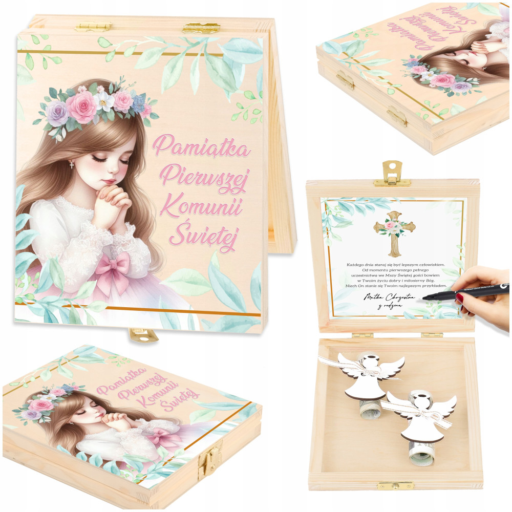 Pudełko z życzeniami i miejscem na podpis świetnie sprawdzi się jako podarunek dla osób przystępujących do Komunii. Ten upominek będzie zarówno praktyczny, jak i symboliczny, podkreślający znaczenie tej uroczystości.