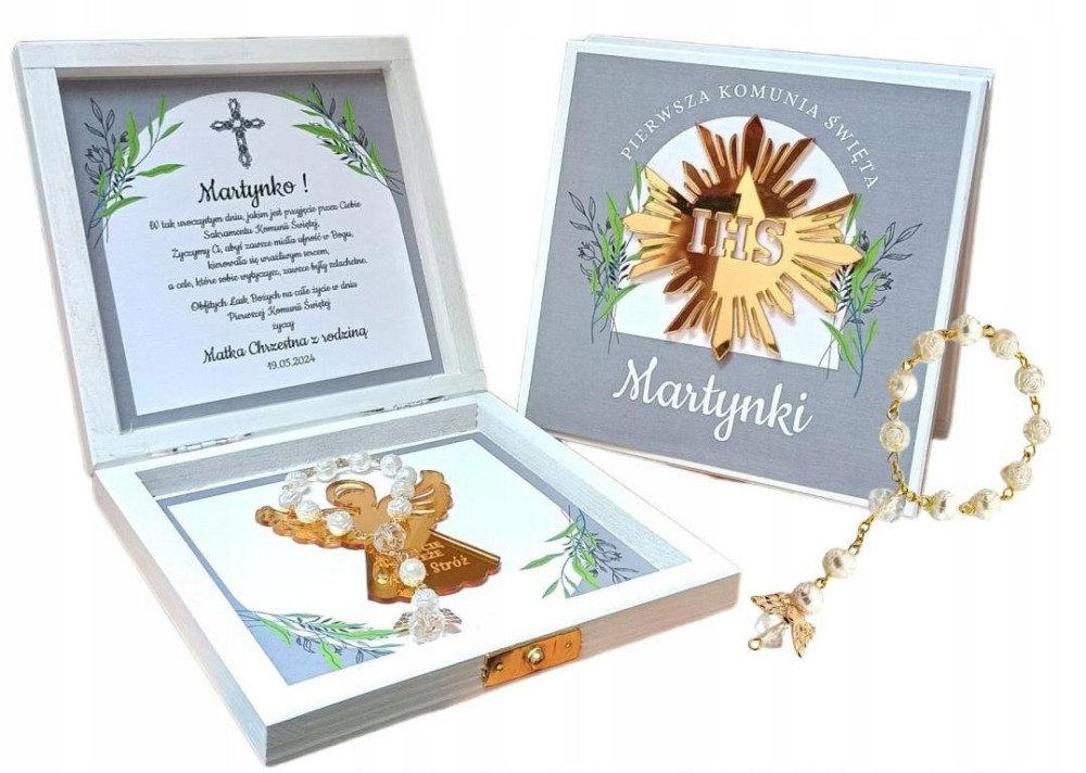 Drewniane pudełeczko z personalizowanymi życzeniami różańcem i aniołkiem