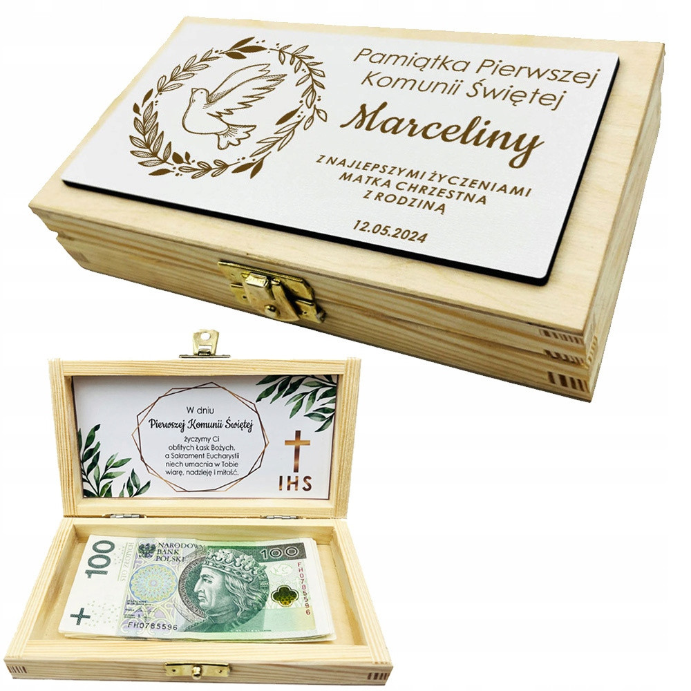 Drewniane pudełko na pieniądze z wybranym przez Ciebie grawerem oraz wklejonymi życzeniami w środku. Pudełeczko łączy walory estetyczne oraz użytkowe, a dzięki spersonalizowanemu grawerowi pozostanie pamiątką na wiele lat.