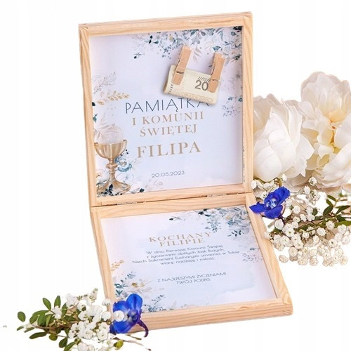 Przepiękne pudełko wykonane z wysokiej jakości drewna to oryginalny sposób, aby wręczyć pieniądze z okazji Pierwszej Komunii Świętej chłopczykowi lub dziewczynce. Motyw graficzny białych róż i konwalii nawiązuje do uroczystości. Zamów płaskie pudełko z personalizacją. Taki upominek mogą wręczyć Rodzice Chrzestni lub Dziadkowie.