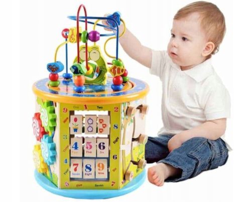 Na każdym z sześciu boków oraz na górze i spodzie zabawki jest umieszczona inna zabawka wpływająca na rozwój dziecka: