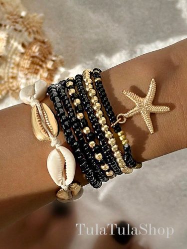 DUŻY ZESTAW: SIEDEM bransoletek w letnim stylu, w tym jedna zapinana bransoletka z muszelek kauri - hit lata!