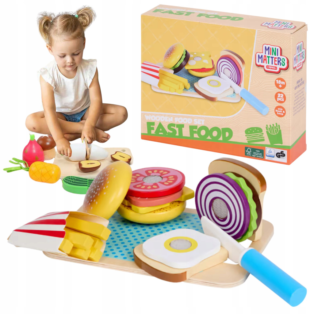 ✨Zestaw drewnianych artykułów spożywczych Mini Matters to zabawka edukacyjna wykonana z certyfikowanego drewna FSC®. Elementy łączone na rzep umożliwiają dzieciom bezpieczne krojenie składników i przygotowanie potraw, co wspiera rozwój ich zdolności manualnych oraz wyobraźni.