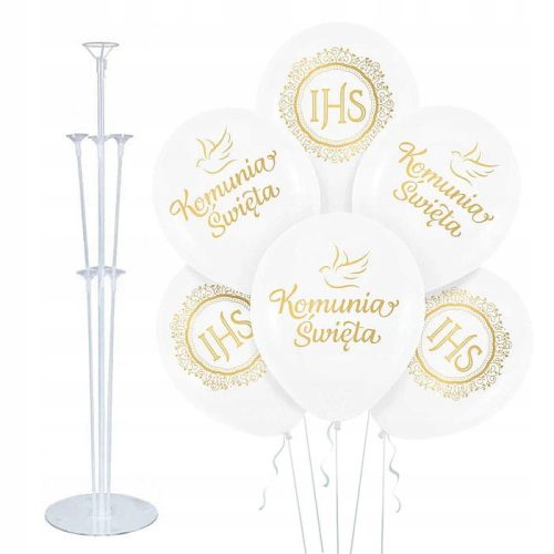 Nasz zestaw zawiera stojak na balony wraz z balonami komunijnymi. Wśród nich znajdują się dwa rodzaje balonów lateksowych. Na jednym znajduje się napis Komunia Święta z gołębicą, na drugim zaś nadruk z napisem IHS.